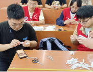 在活动过程中,志愿者们两两一组,为参加活动的同学分发活动道具——手工扭扭棒,并示范如何用其制作一朵承载先辈精神,表达我辈敬意的白色小花。