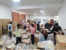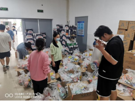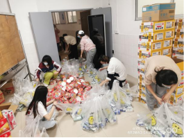 将四十多种类一千一百多件商品按照等价原则打包成一千七百多袋物资,是一个非常巨大的工程。因此,学工办召集了三十余位志愿者协助分配。为了能够让同学们快点拿到物资,志愿者们不舍昼夜,拆箱装包,忙得晕头转向,眼花缭乱,累得倒头就睡,奋斗了一天半才终于完成此项艰巨的任务。