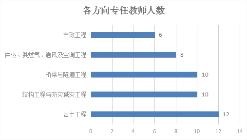 优化了培养方向,并对教师进行了归队管理。目前设有5个学科方向,岩土工程,结构工程与防灾减灾工程,桥梁与隧道工程,供热、供燃气、通风及空调工程、市政工程。均为《土木工程一级学科简介》中规定的学科方向。各方向专任教师数量如图1所示。符合每个学科方向不少于6人的基本条件。