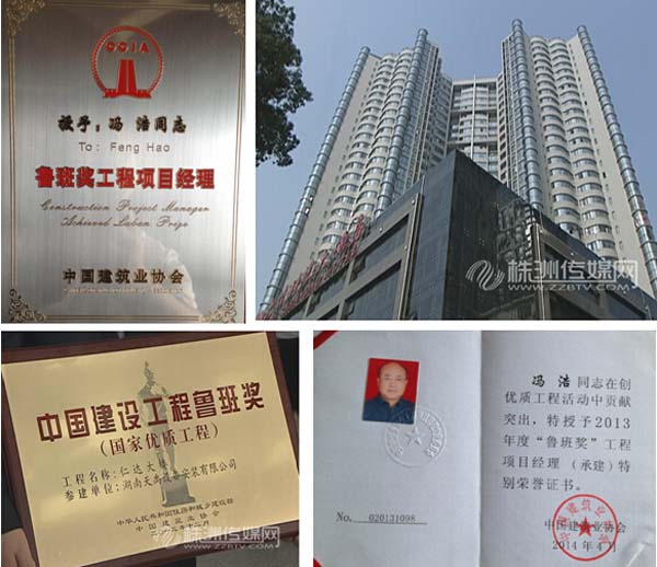 在冯浩校友的办公桌上,我们发现摆放着一块“鲁班奖”牌匾。冯浩校友很自豪地向我们介绍,2013年12月,在北京召开的中国建设工程鲁班奖表彰大会上,自己任项目经理的株洲市仁达大楼荣获中国建设工程鲁班奖,实现了本埠建筑这一奖项零的突破,也代表着一个地区和建筑企业的最高建筑水平。